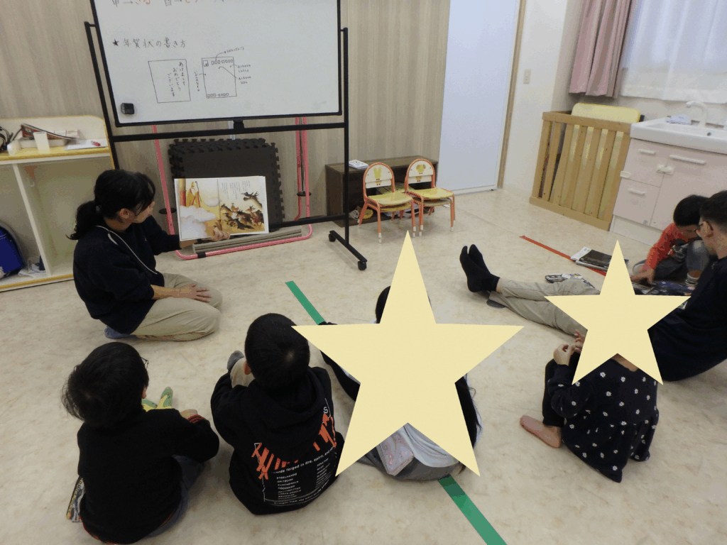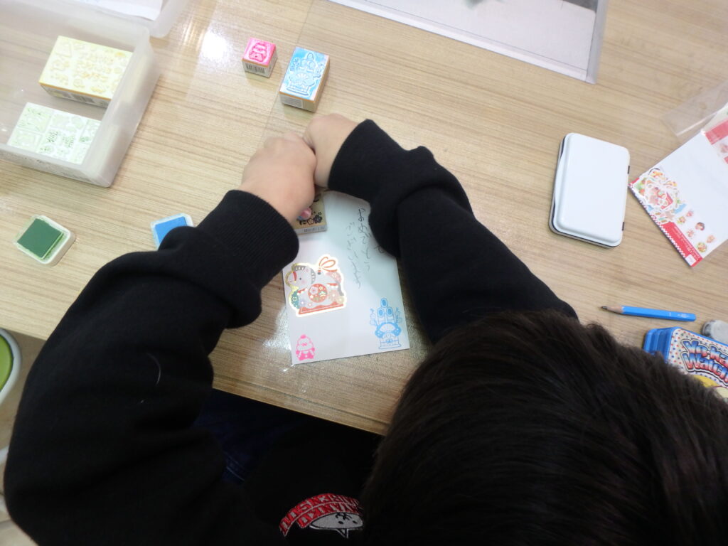 小学生のお友達によっては、文字書きができる、まだ少し難しいとそれぞれですが、干支のお話、年賀状の書き方も学びながら取り組みました。