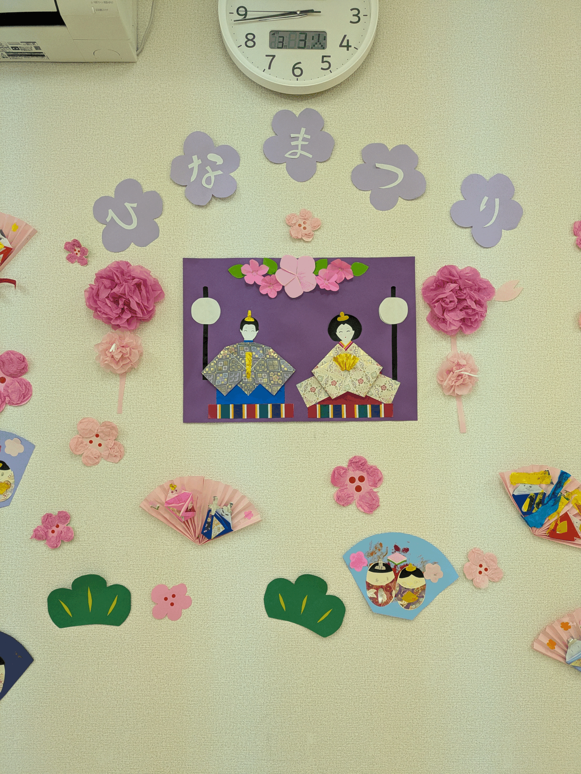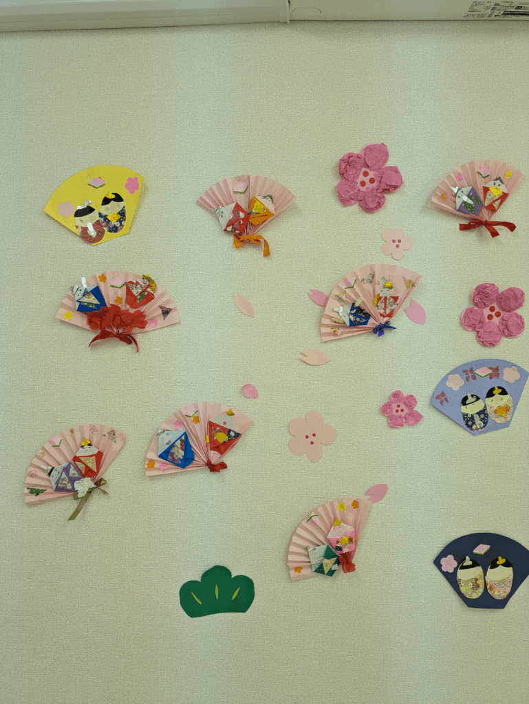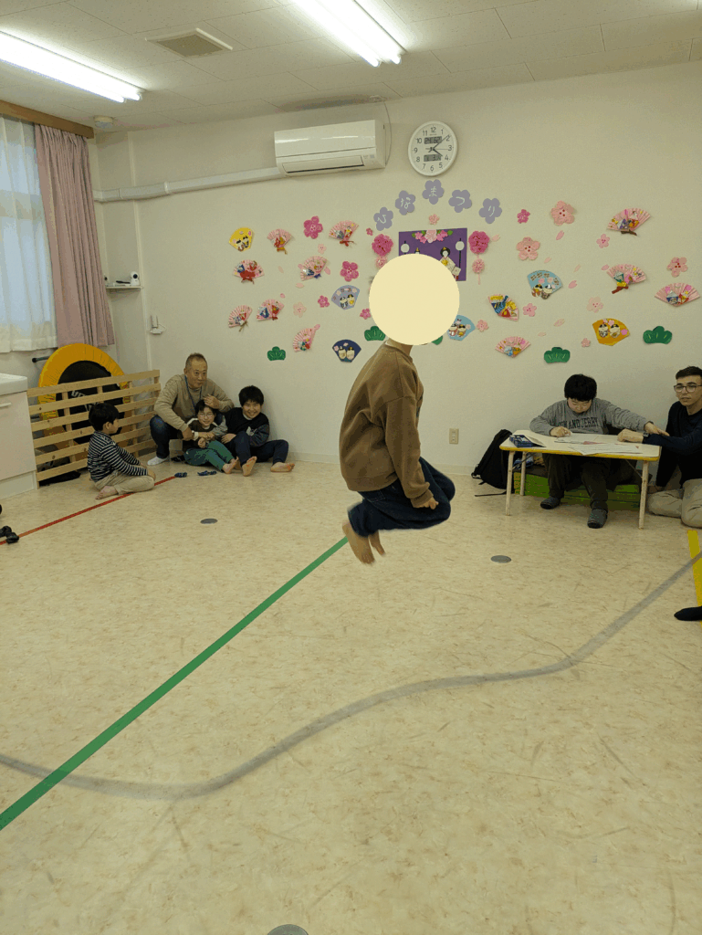 グレイスでは、季節や行事などに応じて壁面に様々な装飾やディスプレイをして、視覚でその時を楽しんでもらうこと、季節感を感じてもらえる装飾の取り組みを行っています。今年のひな祭り装飾は、画用紙の扇子にお内裏様とお雛様を折り紙で作り貼り付けています。お子さんによって手先の器用さも確認しながら、その子に合わせた内容を個々に伝え作り上げています。折り紙製作が好きな子がグレイスには多く、普段の活動時間内で宿題が終わり自由時間になると折り紙を持ち出し何かを作り始めると、僕も私もとそれぞれが好きな物を作って遊んでいます。この日のはづきグループの集団活動は、大縄跳びです。最初は2回程しか跳ぶことができなかった子も、みんなで遊びながら応援してもらいながら日々取り組んでいくうちに、跳ぶ回数が増えたり、歌に合わせてリズムよく繰り返し跳ぶことができるようになっています。